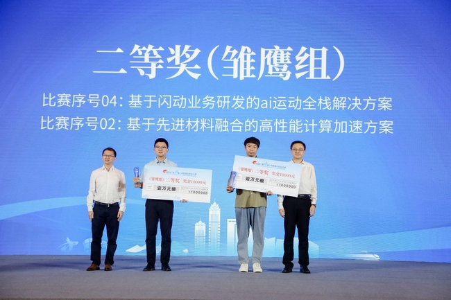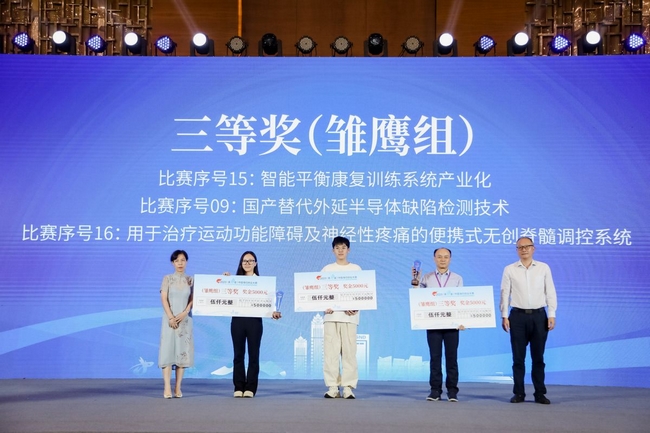 致公黨中央聯(lián)絡(luò)部副部長、留學(xué)人員委員會秘書長周慧(圖左),蘇州市人民政府副秘書長吳旭翔(圖右)為獲得“雛鷹組”一等獎的項(xiàng)目團(tuán)隊(duì)代表頒獎